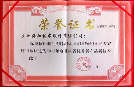 甘肃省优秀新产品新技术荣誉证书