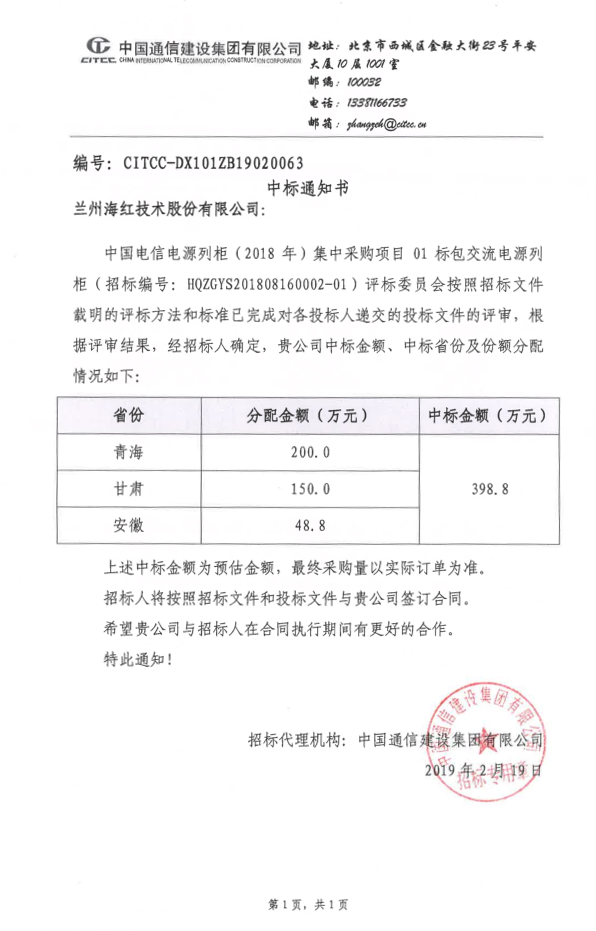 我公司参与投标的“中国电信交/直流电源列柜集中采购项目”成功中标。此次中标是对我公司技术、工艺、质量、服务等综合竞争力的再次肯定,将进一步扩大我司的品牌影响力,对2019年度经营指...