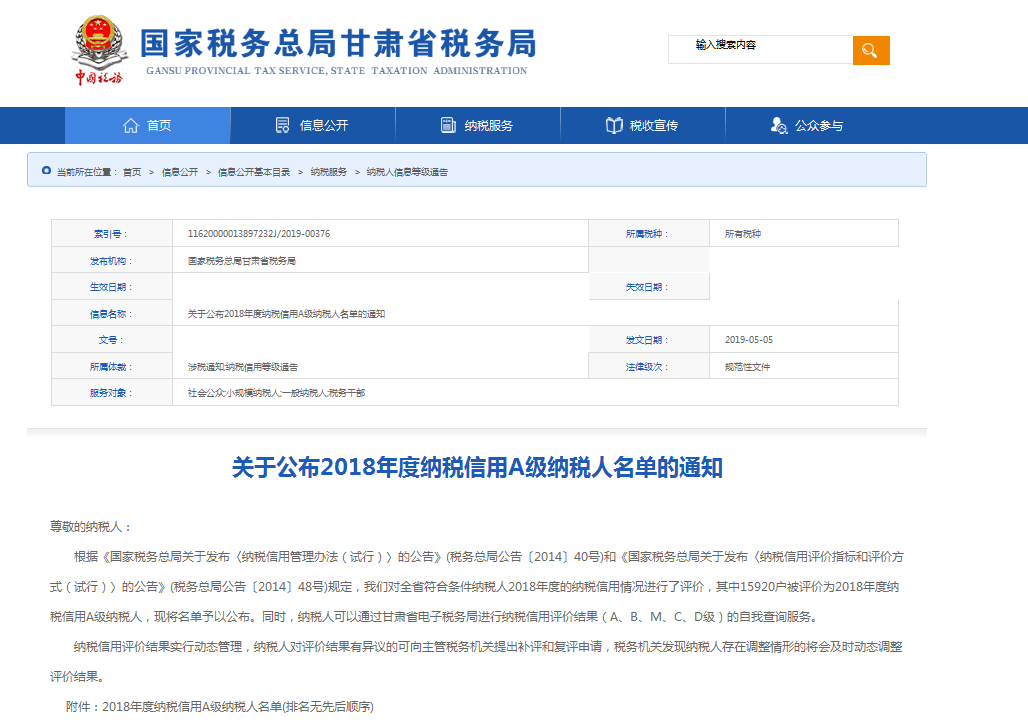我公司被国家税务总局甘肃省税务局评价为“2018年度纳税信用A级纳税人”