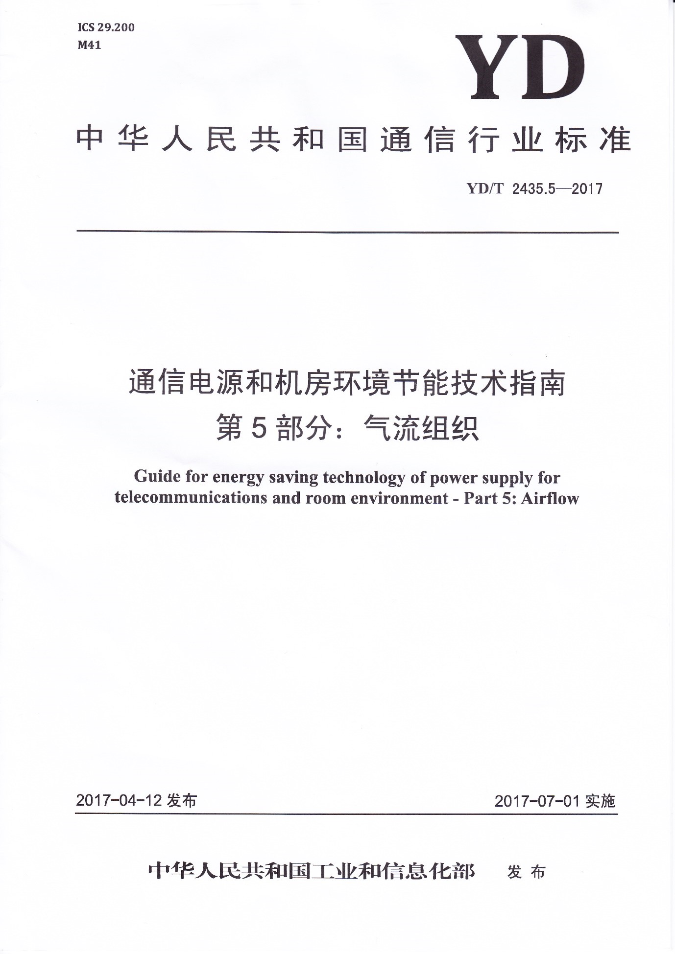 我公司参与起草的《通信电源和机房环境节能技术指南 第5部分:气流组织》行业标准(YD/T 2435.5-2017)经中华人民共和国工业和信息化部批准发布,于2017年7月1日正式实...