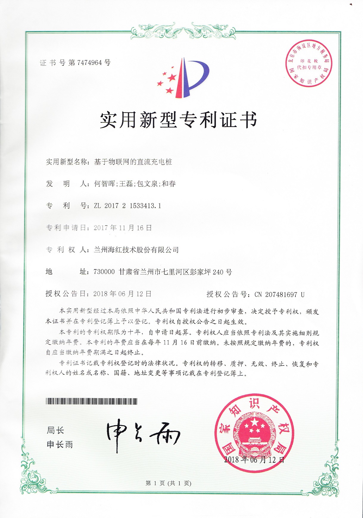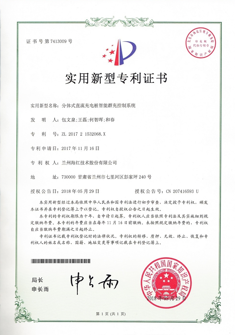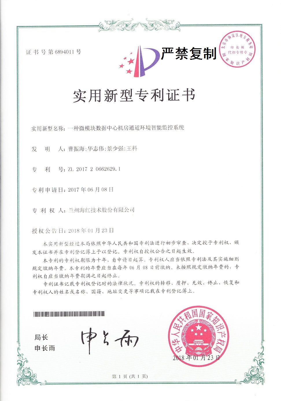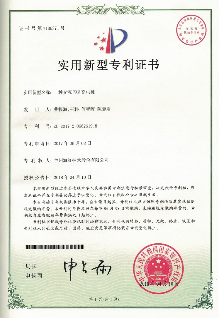 我公司又取得三项实用新型专利,至此我公司申请受理的专利数累积84项(其中发明专利17项,实用新型专利56项,外观设计专利3项,软件著作权8项),已获得授权64项(其中发明专利8项,...