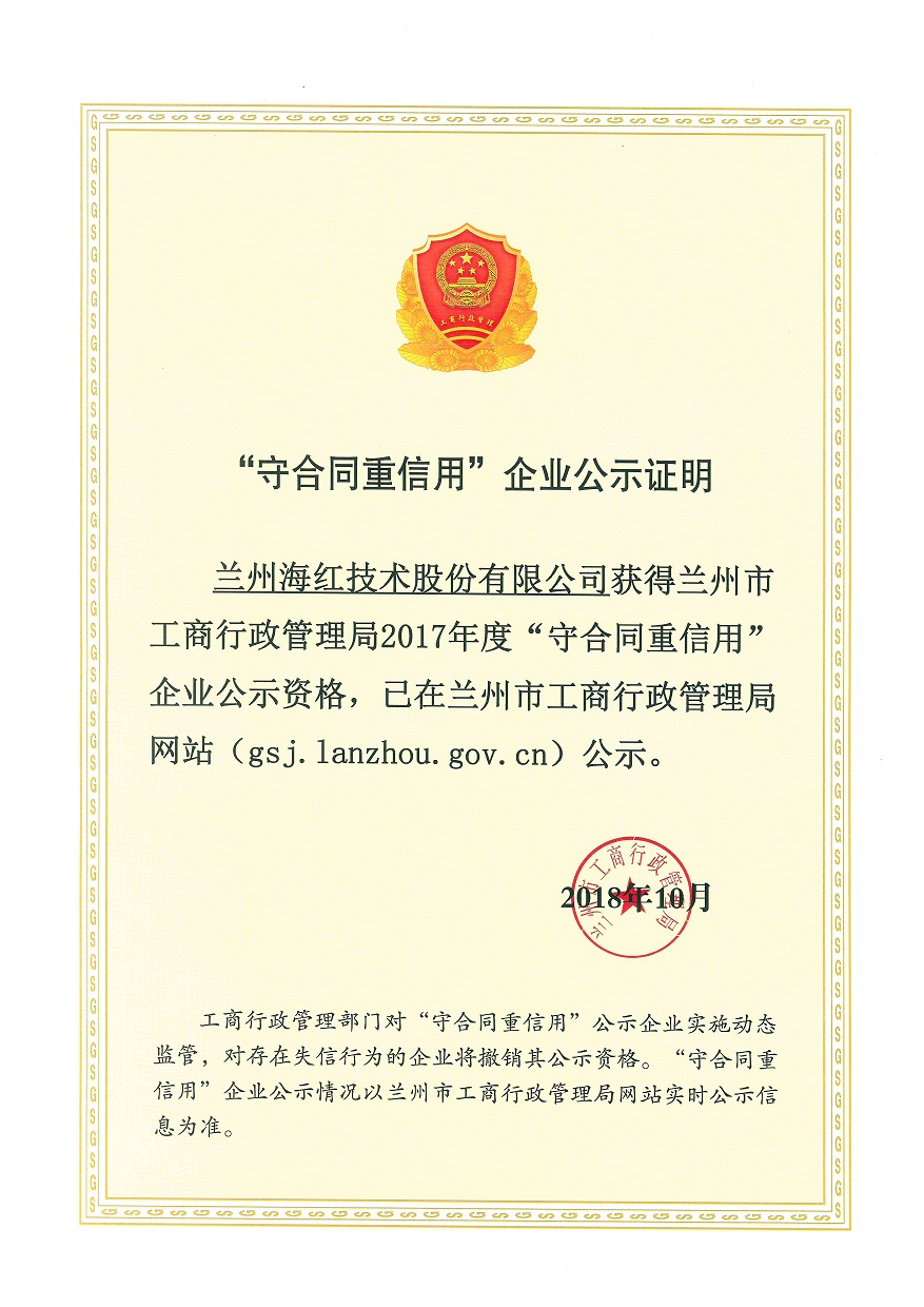 我公司被兰州市工商行政管理局和兰州市高新技术产业开发区管理委员评定为2017年度“守合同、重信用”企业。