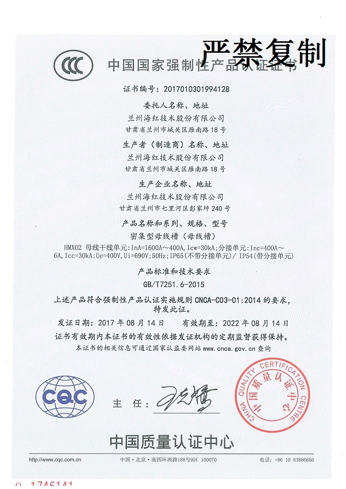我公司又有两个产品取得CCC证书、一个产品取得检验报告 By 3044am永利技术 2017-08-31 00:00:00 0次 我公司的“密集型母线槽 (HMX01型)与密集型母线槽 (HMX02型)”产品通过中国质量认证中心的CCC认证并取得证书。至此,我公司共取得14个产品的CCC认证证书。 我公司的“背板式温控设备(HJZL-01)”产品取得中国泰尔实验室的委托测试测试报告。至此,我公司共取得32个产品的试验检验报告。 上一篇:兰州市工信委党组书记、主任王正祥一行莅临我公司调研指导 下一篇:我公司设计中心被认定为“省级工业设计中心”