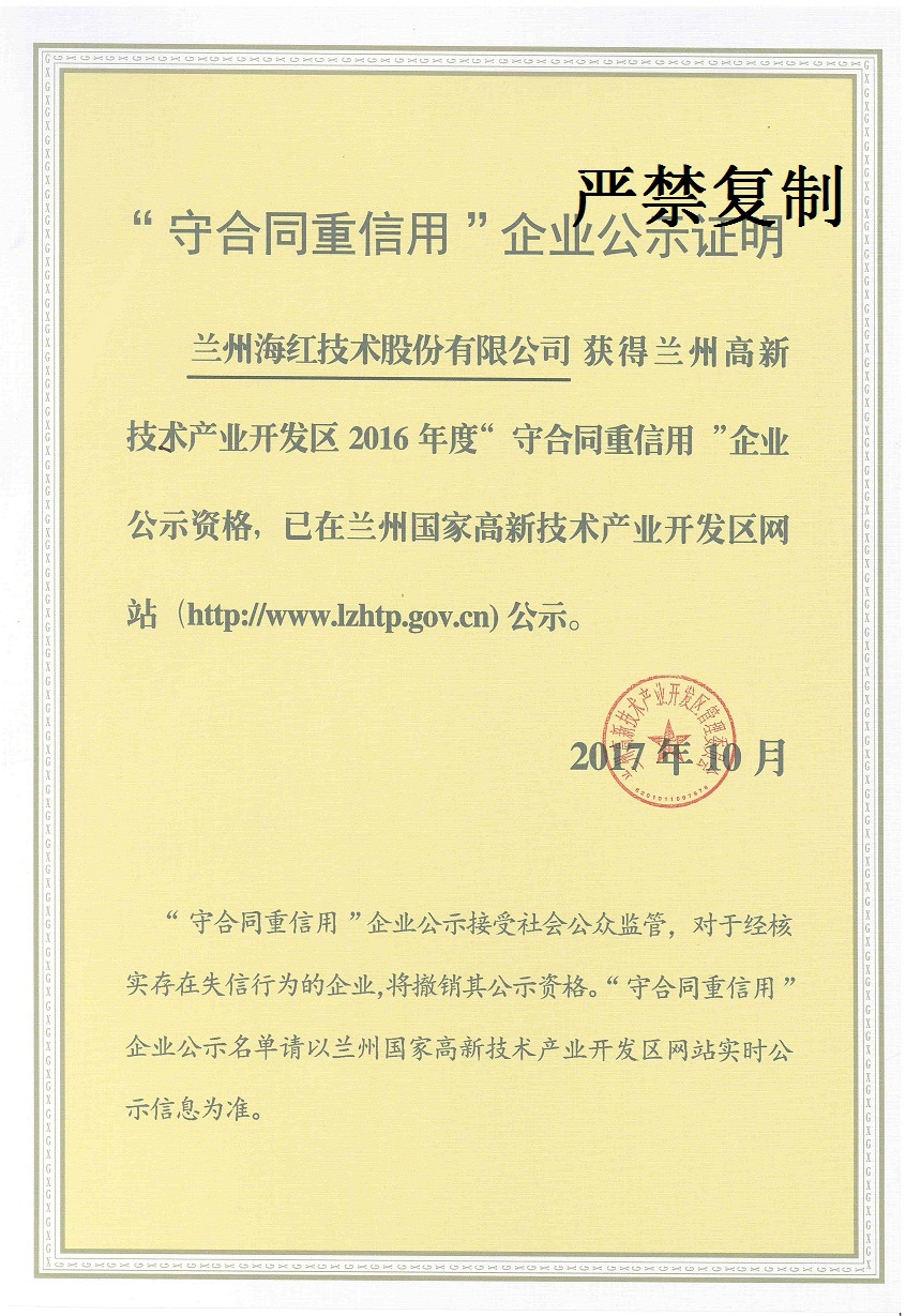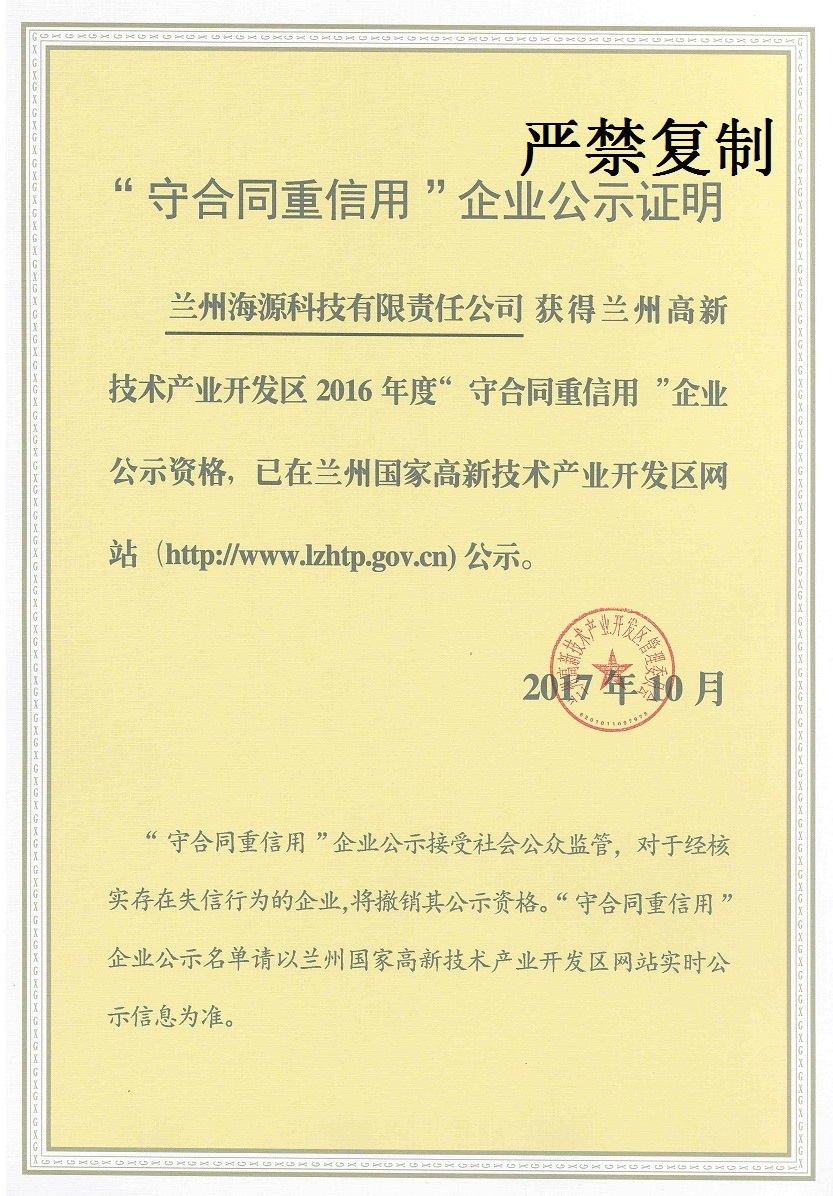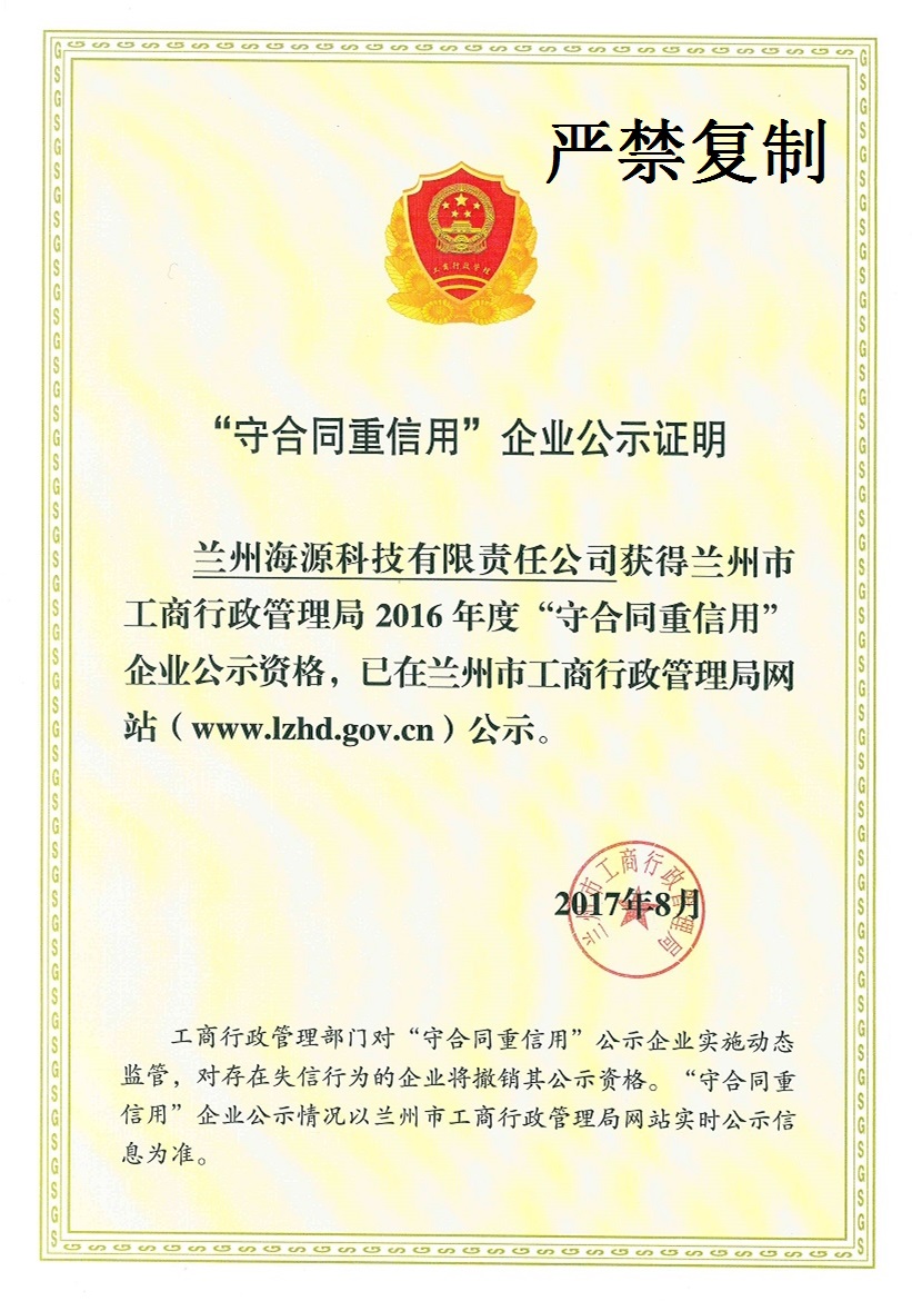 我公司及子公司(海源科技)分别荣获2016年度甘肃省、兰州市、兰州高新区“守合同、 重信用”企业荣誉称号 By 3044am永利技术 2017-11-24 00:00:00 0次 我公司及子公司(海源科技)被兰州市高新技术产业开发区管理委员会评定为2016年度“守合同、重信用”企业。同时我公司被甘肃省工商行政管理局评定为2016年度“守合同、重信用”企业,子公司(海源科技)被兰州市工商行政管理局评定为2016年度“守合同、重信用”企业。 上一篇: 中国铁塔股份有限公司山西临汾分公司一行六人来我司考察交流 下一篇:我公司顺利通过“知识产权管理体系”认证,取得认证证书