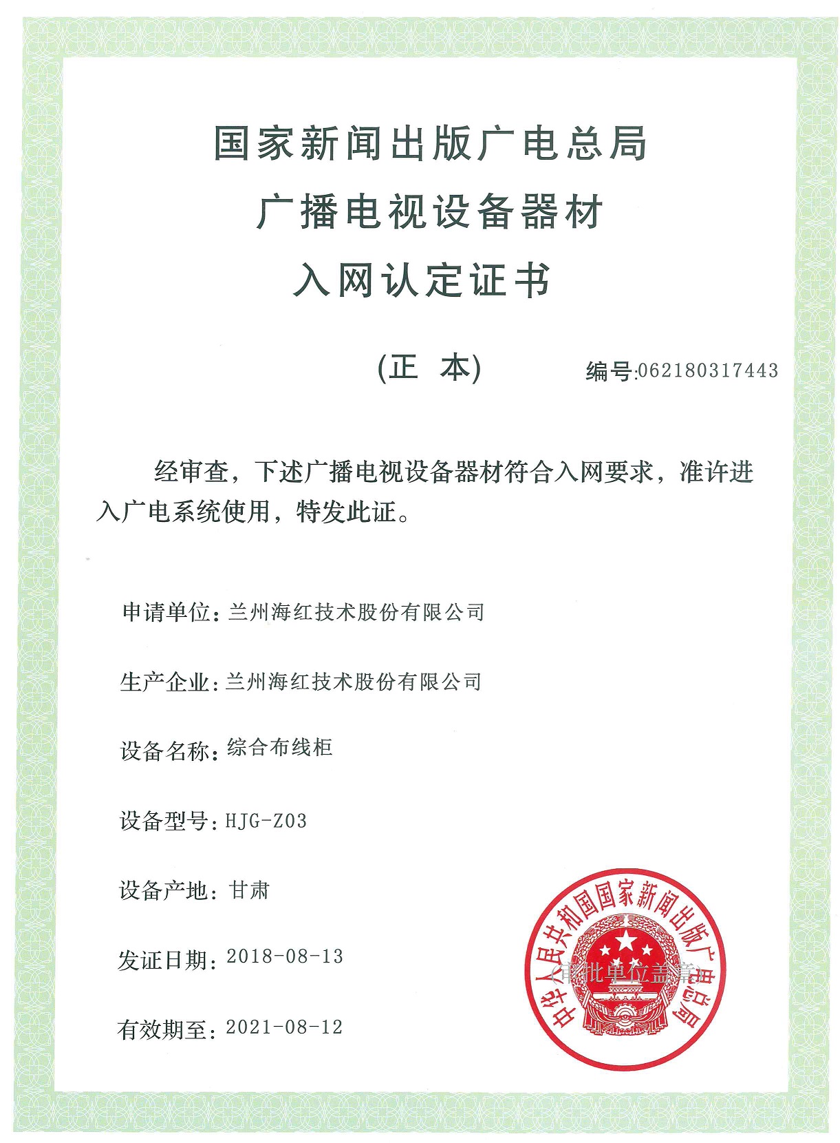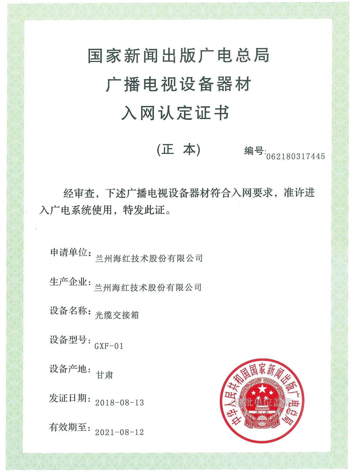 我公司四个产品取得国家新闻出版广电总局广播电视设备器材入网认定证书 By 3044am永利技术 2018-08-15 00:00:00 0次 我公司的“光缆分纤箱(GF-KJN)、光纤配线架(GPX-01)、光缆交接箱(GFX-01)、综合布线柜(HJG-Z03)”产品取得国家新闻出版广电总局广播电视设备器材入网认定证书。 上一篇:我公司又取得两项实用新型专利 下一篇:我公司又取得三项实用新型专利