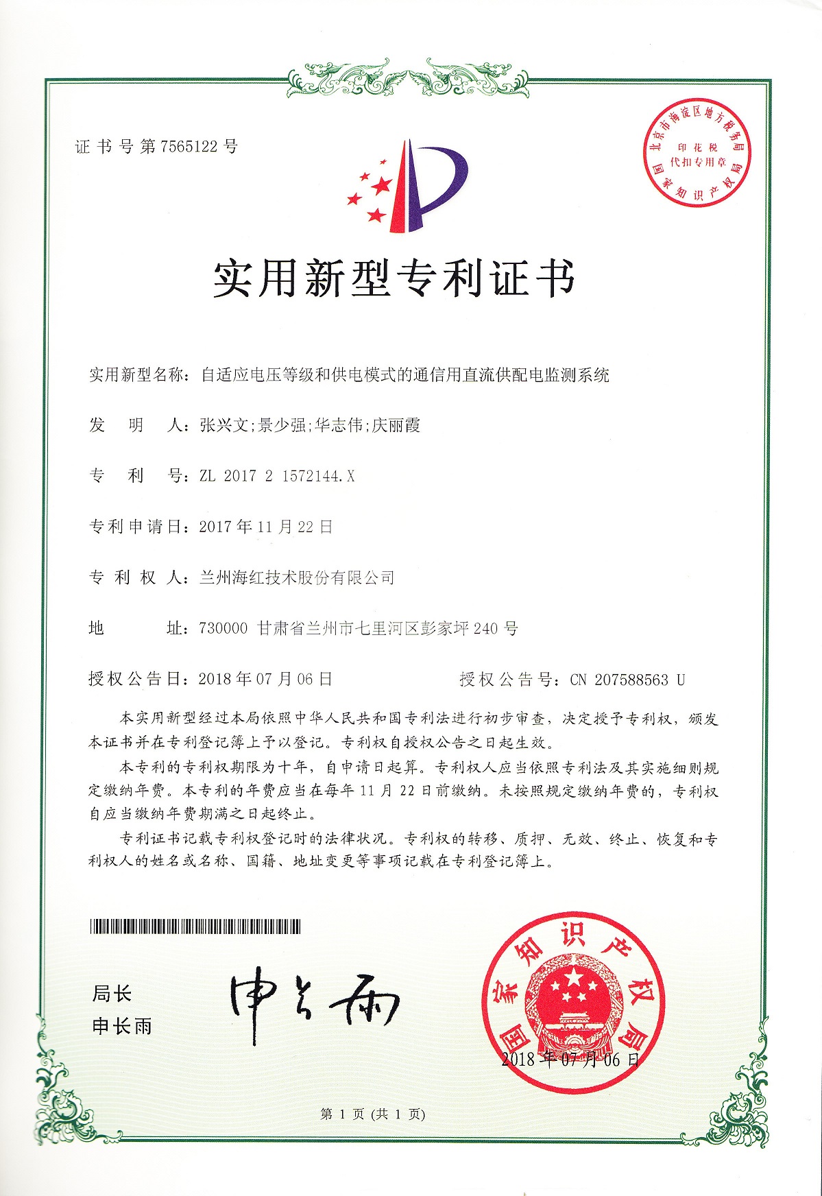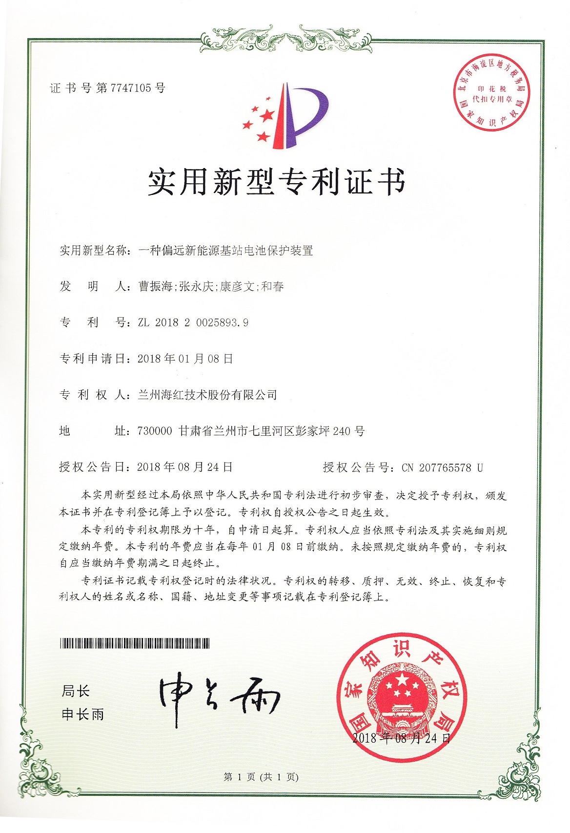 我公司又取得三项实用新型专利 By 3044am永利技术 2018-09-18 00:00:00 0次 我公司又取得三项实用新型专利,至此我公司申请受理的专利数累积84项(其中发明专利17项,实用新型专利56项,外观设计专利3项,软件著作权8项),已获得授权64项(其中发明专利8项,实用新型专利45项,软件著作权登记8项,外观设计专利3项)。 上一篇:我公司四个产品取得国家新闻出版广电总局广播电视设备器材入网认定证书 下一篇:我司与兰州交通大学新能源与动力工程学院共建“新能源汽车充电技术联合研究中心”暨设立“3044am永利奖学金”