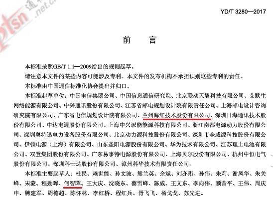我公司参与起草的《网络机柜用分布式电源系统》(YD/T 3280-2017)行业标准经中华人民共和国工业和信息化部批准发布,已于2018年01月01日正式实施。我公司技术中心研发部工程师何智晖参与了该标准的起草。该标准是继《通信电源和机房环境节能技术指南 第5部分:气流组织》标准之后,第二个我司参与起草正式出版的行业标准。