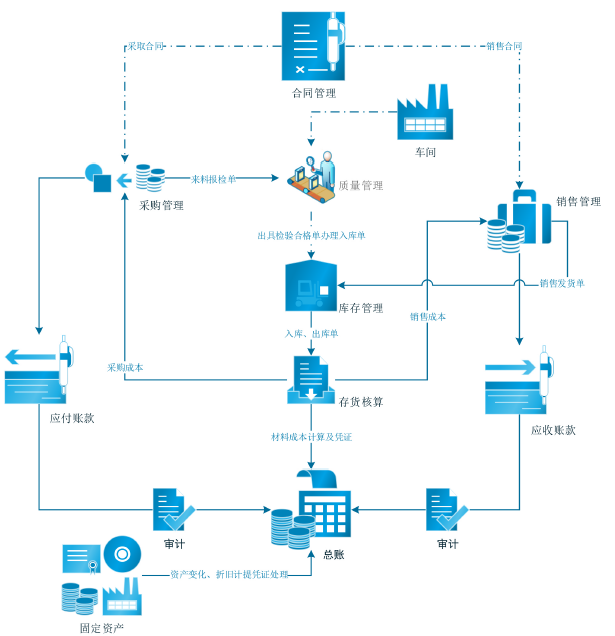 将企业实际管理需求与先进信息技术完美结合, 打造企业全程一体化管理体系,打破各部门、各区域、各系统之间沟通和协作的壁垒,建立规范、灵捷、高效的业务流程,实现销售、客户、生产、库存、采购、人资、财务、办公等所有环节全程无缝管理,确保了数据信息在传递过程中的准确性、时效性和有效性,使企业的人、财、物、供、产、销全面结合、全面受控、实时反馈、动态协调、以销定产,以产求供,降低成本,全面提升核心竞争力。