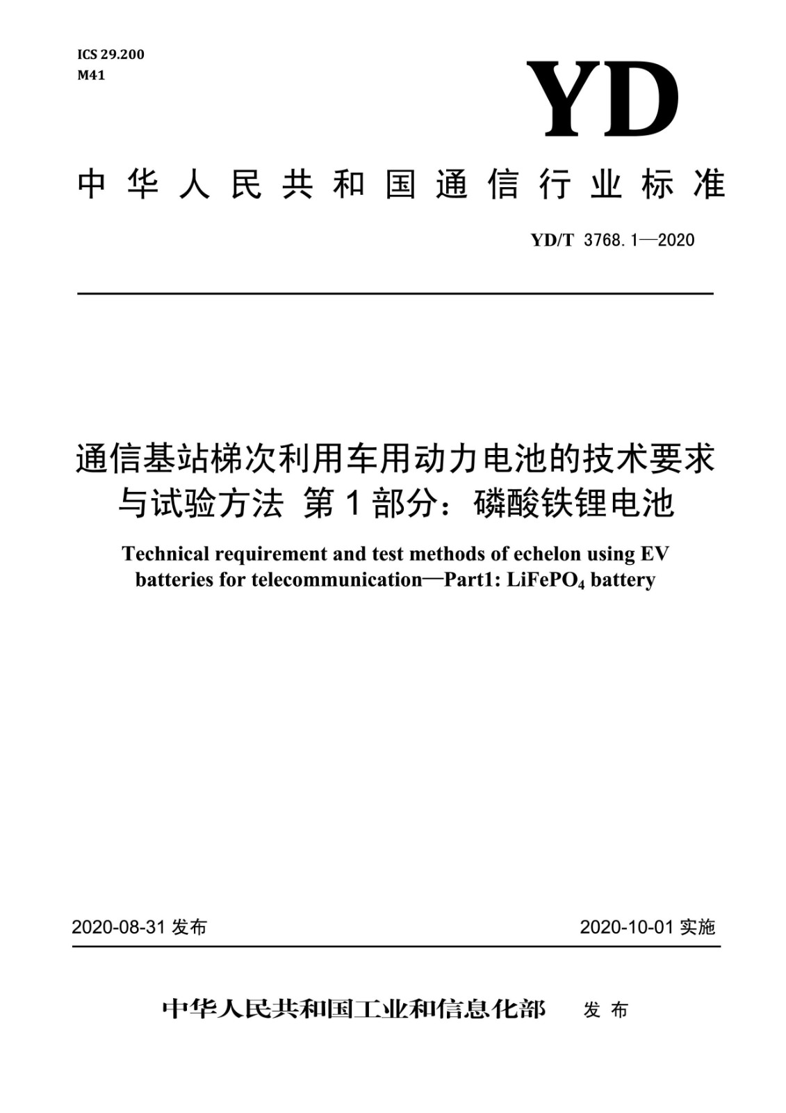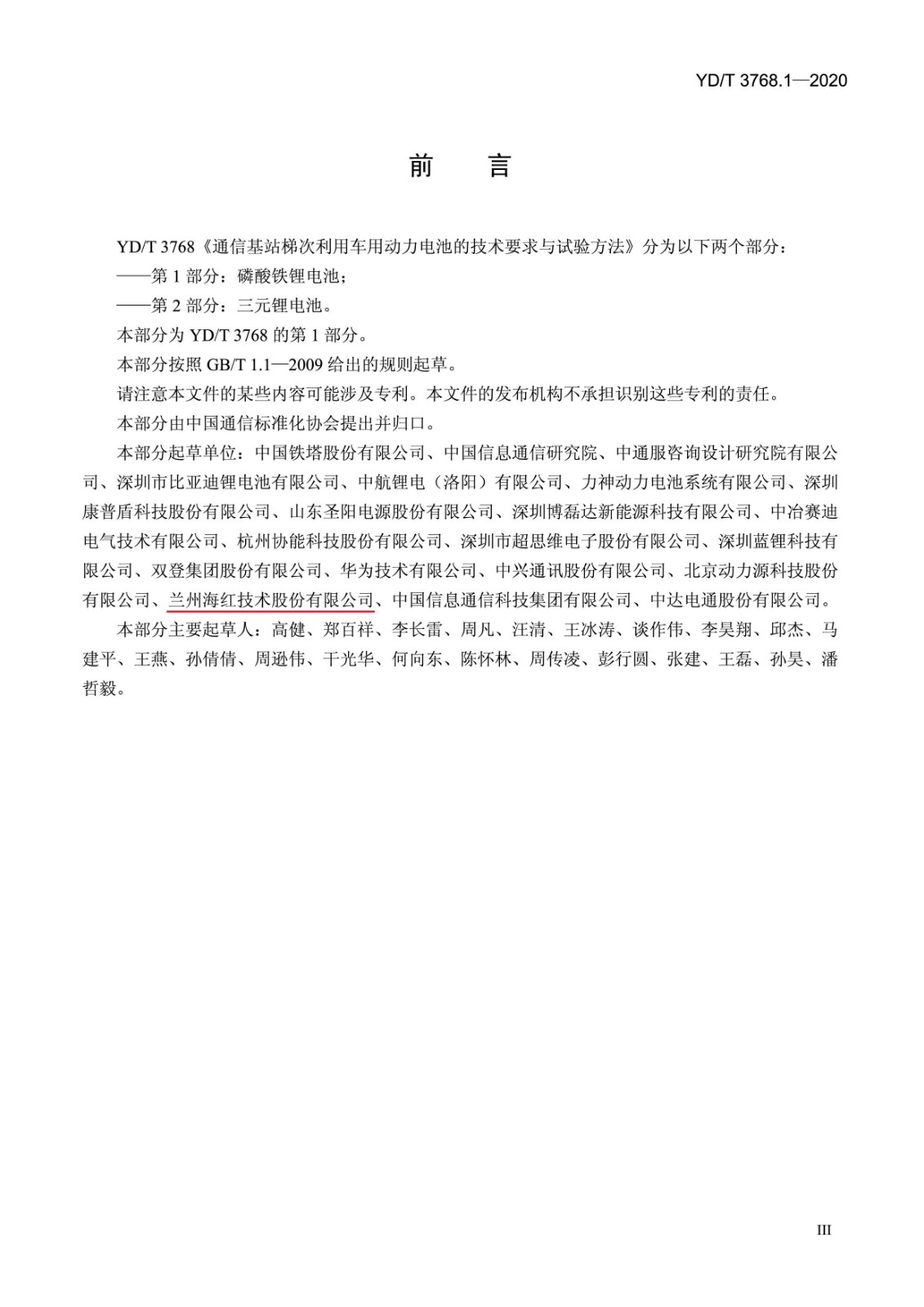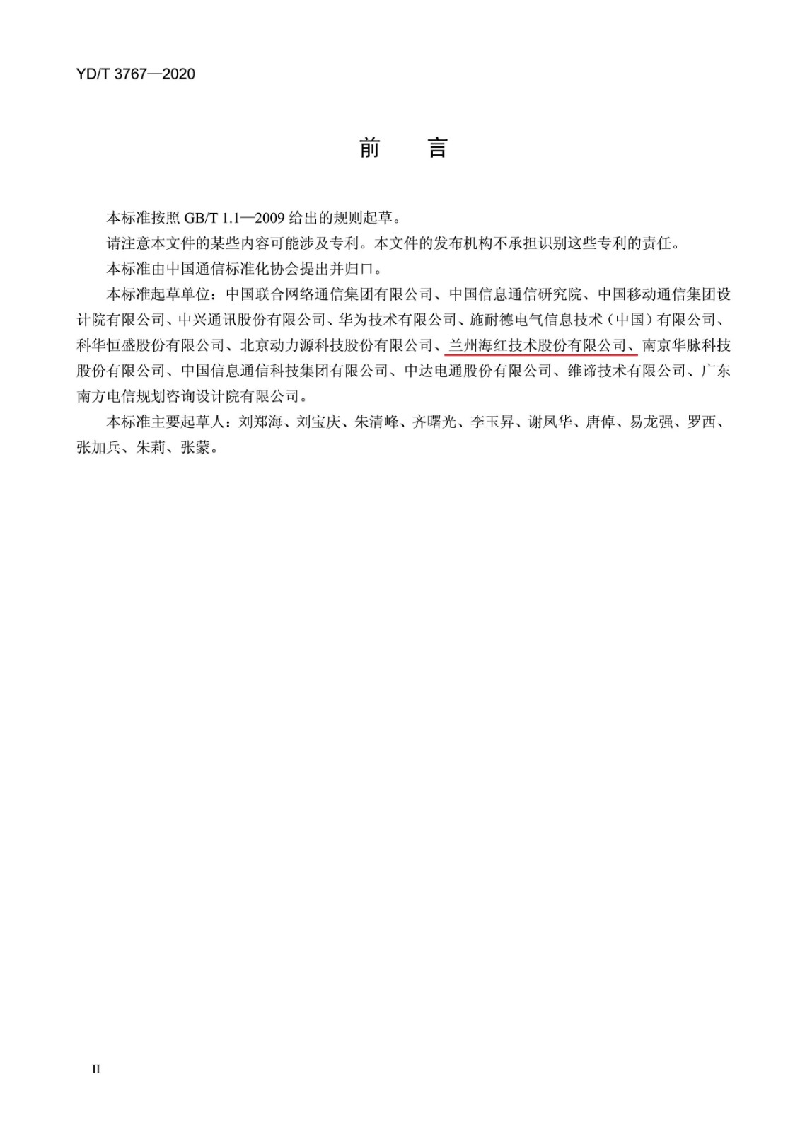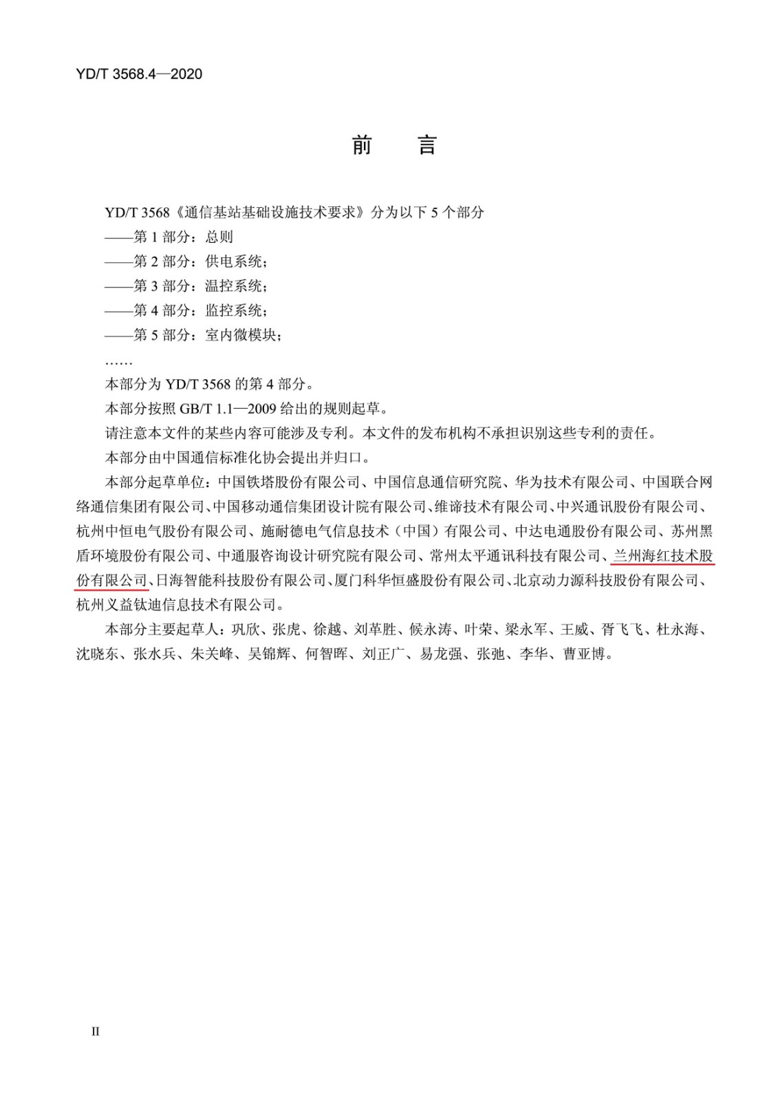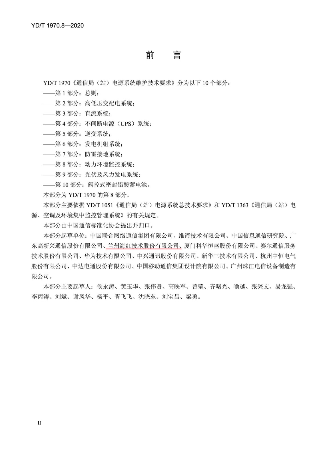 我司参与起草的《通信局(站)电源系统维护技术要求 第 8 部分:动力环境监控系统》(YD/T 1970.8-2020)、《通信基站基础设施技术要求第 4 部分:监控系统》(YD/T 3568.4-2020)、《通信基站梯次利用车用动力电池的技术要求与试验方法第 1 部分:磷酸铁锂电池》(YD/T 3768.1-2020)、《数据中心用市电加保障电源的两路供电系统技术要求》(YDT3767-2020)四项行业标准经中华人民共和国工业和信息化部批准发布,前两项已于2020年07月01日实施,后两项已于2020年10月01日实施。以上标准是继《通信电源和机房环境节能技术指南第5部分:气流组织》、《网络机柜用分布式电源系统》、《通信电源和机房环境节能技术指南 第2部分:应用条件》、《通信用240V直流供电系统使用技术要求》、《通信局(站)电源系统总技术要求》、《通信用240V/336V直流配电单元》、《通信机房用光纤槽道》、《通信基站基础设施技术要求 第3部分:温控系统》、《通信基站基础设施技术要求 第1部分:总则》、《通信基站基础设施技术要求 第2部分:供电系统》十项标准之后,由我司参与起草正式出版的第11项、第12项、第13项、第14项行业标准。