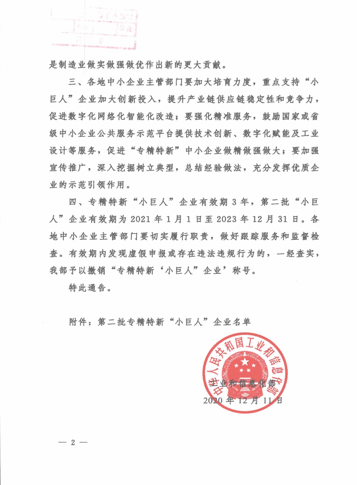 根据中华人民共和国工业和信息化部印发《工业和信息化部关于公布第二批专精特新“小巨人”企业名单的通告》(工信部企业函〔2020〕335号)文件,我司被工业和信息化部授予“专精特新‘小巨人’企业”称号。