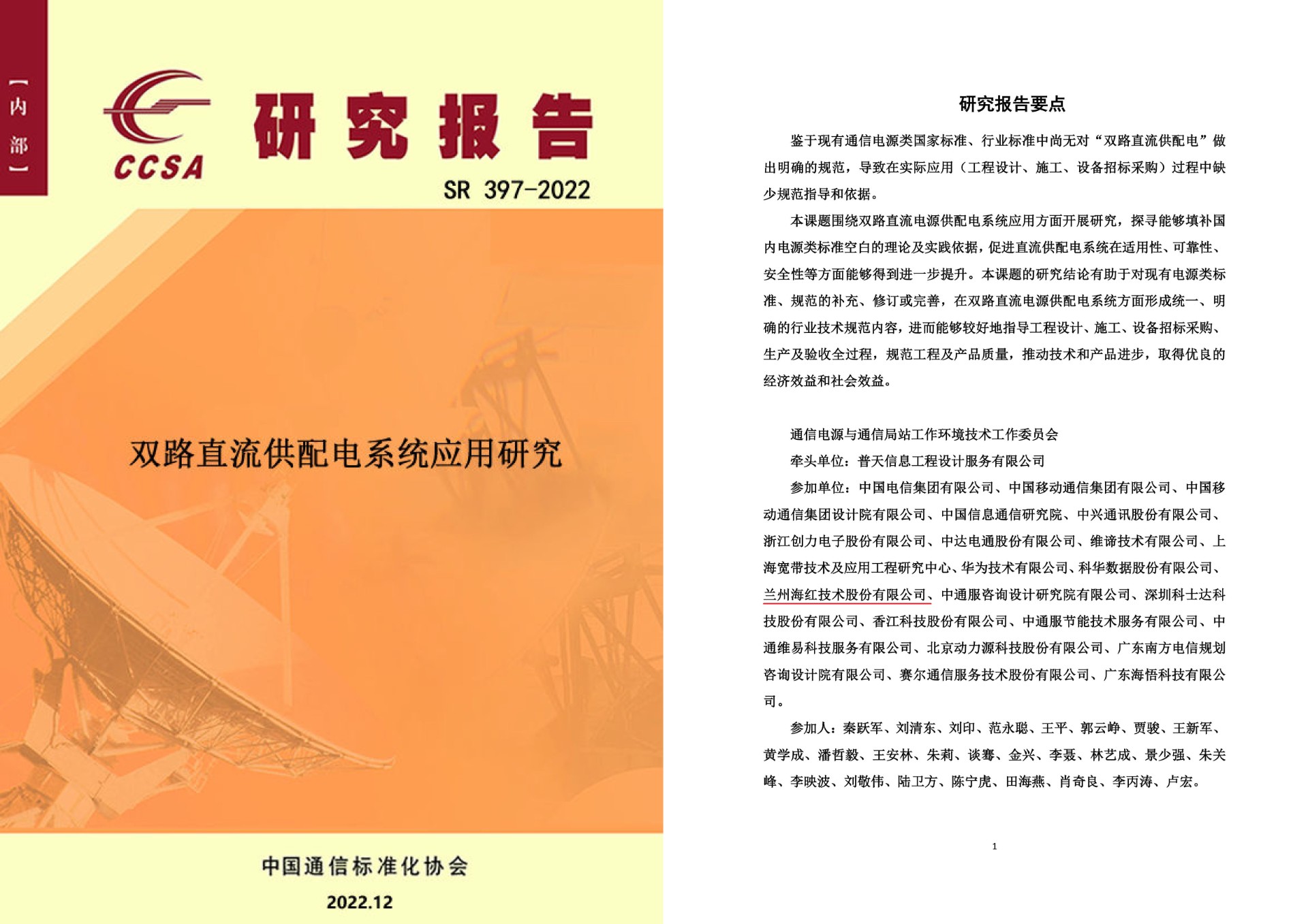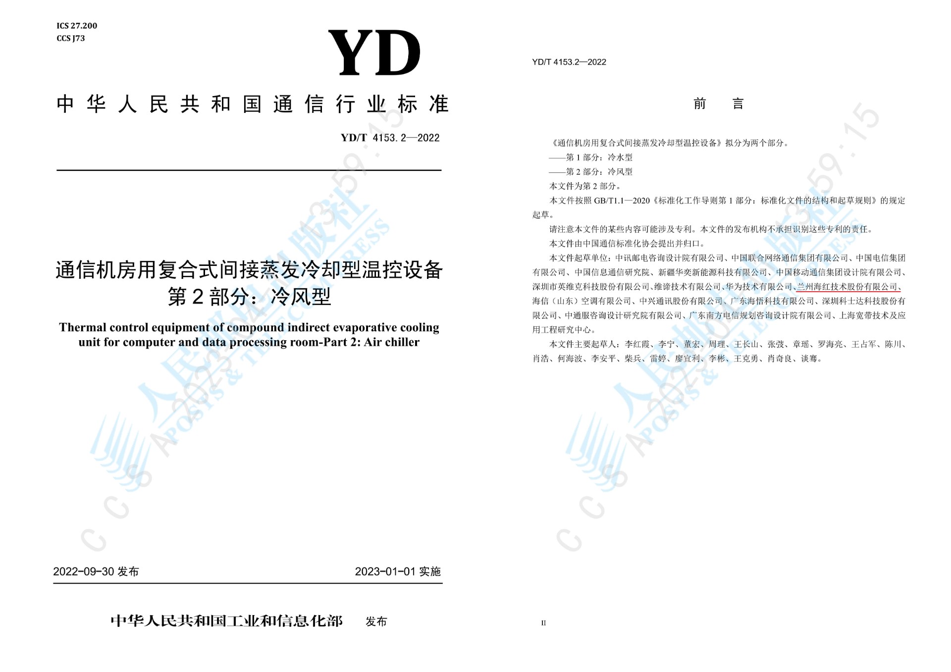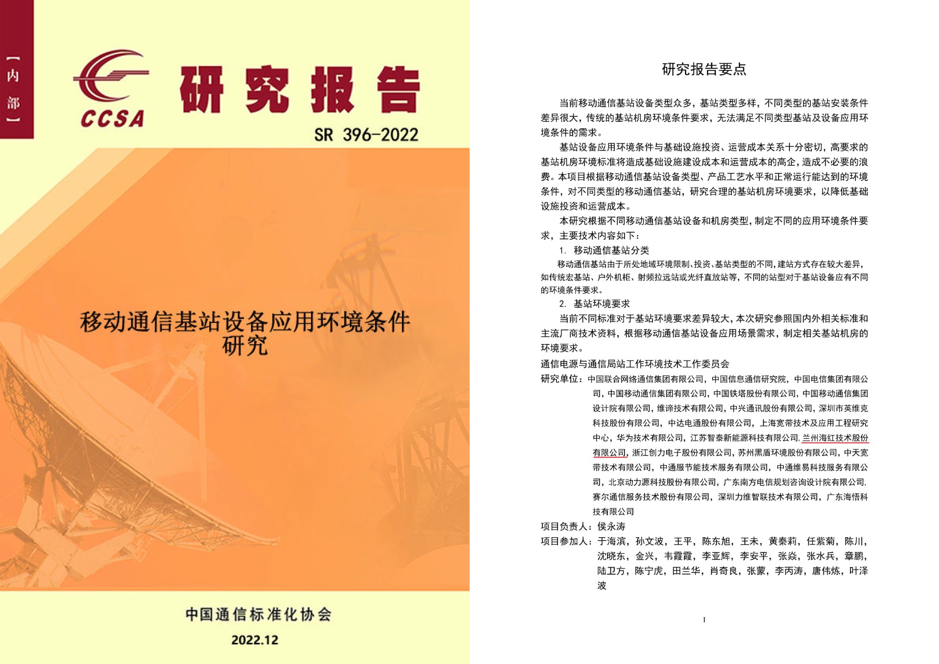 我司参与起草的两项行业标准《通信机房用复合式间接蒸发冷却型温控设备 第1部分:冷水型》(YD/T 4153.1-2022)及《通信机房用复合式间接蒸发冷却型温控设备 第2部分:冷风型》(YD/T 4153.1-2022)经中华人民共和国工业和信息化部批准发布,已于2023年01月01日实施。同时,我司参与的两项研究课题也于近日出版了研究报告,分别为《双路直流供配电系统应用研究》及《移动通信基站设备应用环境条件研究》。 至此我司共参与起草、修订行业标准19项、研究课题2项,详细情况如下:
