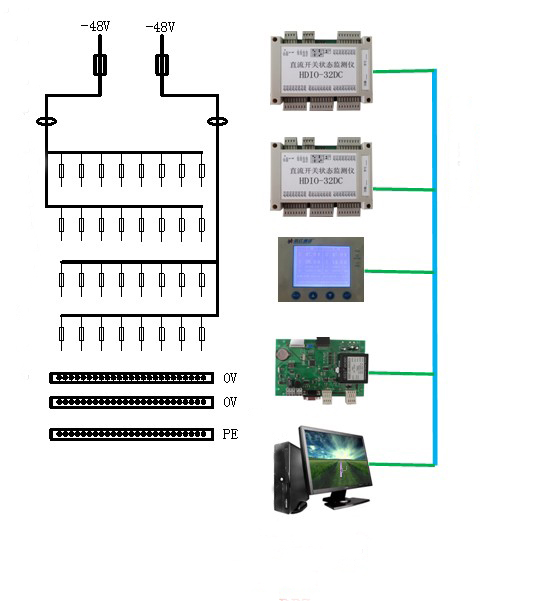 该系统主要应用于通信用直流电源配电设备的运行状态监测,其主要完成主备双路母线电量与配出支路的开关状态的实时监测。实现对96路配电支路状态监测。具有电流、电压超限与配出支路故障声光告警功能。具有RS-232/485等通信接口,方便实现网络化集中监控。