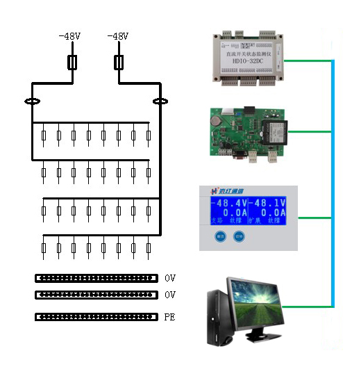 该系统主要应用于通信用直流电源配电设备的运行状态监测,其主要完成主备双路母线电量与配出支路的开关状态的实时监测。实现对96路配电支路状态监测。具有电流、电压超限与配出支路故障声光告警功能。具有RS-232/485等通信接口,方便实现网络化集中监控。