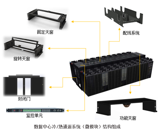 数据中心冷/热通道系统(微模块)是由固定天窗、旋转天窗、功能天窗、封闭门和监控单元和配线系统组成。