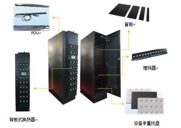 背板式温控设备是由背板式换热器、柜体、PDU(电源分配单元)、盲板、理线器和承重托盘等配件组成。
